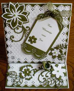 De witte kaart is geponst met een Martha Stuart pons ,op het labeltje een tekst geprint "Een bloemetje voor jou"
